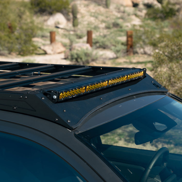The rack features an optional integrated light bar cutout in the front fairing, allowing clean, protected installation of a 40-inch light bar or multiple pod lights. Its low-profile design preserves overhead clearance as it sits just above the factory antenna. Integrated tie-down points and modular mounting provisions enable secure attachment of rooftop tents, awnings, recovery gear, and other accessories. Additional mounting locations support radio antennas, hardcases, flags, and expandable C4 accessories; allowing the rack to scale with your vehicle’s build.