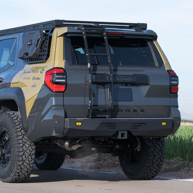 The 4Runner Summit Hatch Ladder is a rear hatch-mounted access ladder designed for the 6th Gen Toyota 4Runner. It provides a stable, lightweight solution for accessing roof-mounted gear while minimizing added weight on the hatch.