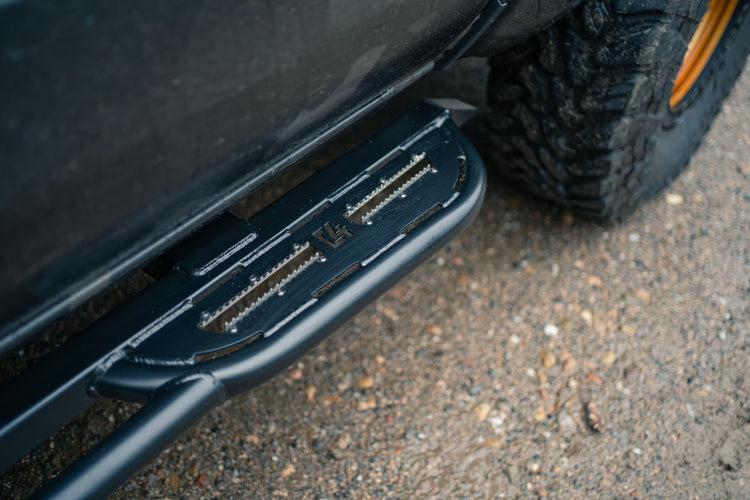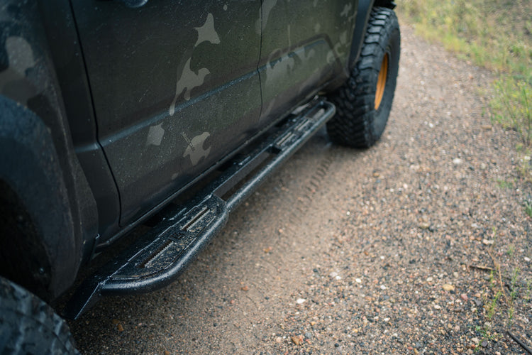 The 4th Gen Tacoma Rock Sliders (2024–2025) are built to give your truck serious protection on the trail while doubling as a functional step. Designed specifically for double cab short bed models equipped with the iForce 4-cyl Turbo or iForce MAX Hybrid, these sliders are engineered for strength without the headache of drilling or welding. Each set bolts directly to the frame using mounting plates that secure along both the side and bottom for maximum durability.