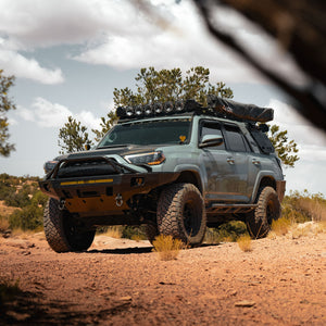 Upgrade your 4th Gen 4Runner (2003–2009) with the Overland Series Front Bumper, engineered for clearance, strength, and off-road capability. Designed to improve approach angles and make room for larger tires, this bumper is built from 3/16″ laser-cut P&O steel with 1/4″ thick frame and winch plates for uncompromising durability. Frame support brackets and a washer tank skid come standard, while fully welded 3/4″ D-ring tabs provide dependable recovery points.